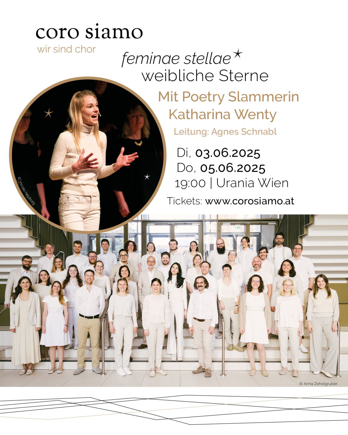 Der coro siamo und die Poetry Slammerin Katharina Wenty präsentieren 2025 ein a-cappella-Programm, das sich ausschließlich den Werken von Komponistinnen widmet. Dieses Konzept entstand als Antwort auf die jahrhundertelange Unterdrückung weiblicher Stimmen in Kirche und Musik.